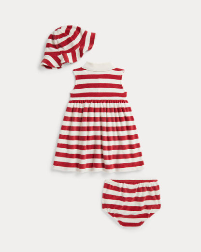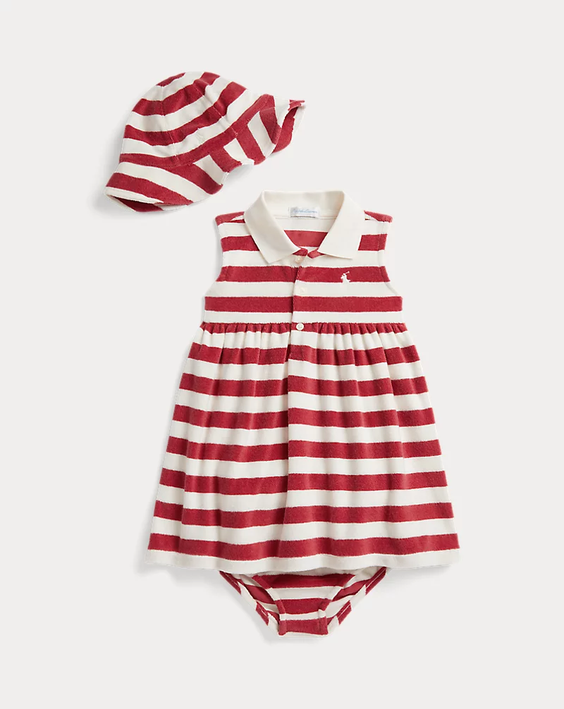 【Baby Girl】Outfits & Gifts for Baby Girl の ストライプド テリー ポロ ドレス、ハット & ブルマー をご紹介。ラルフ ローレンの世界観をお楽しみください。